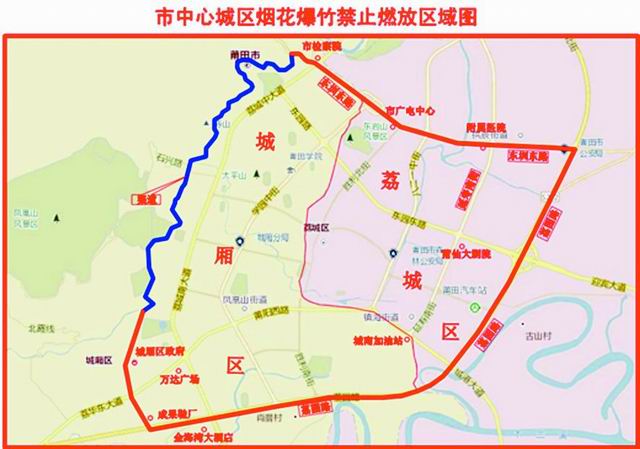 禁止部分区域燃放烟花爆竹:城厢区涉及龙桥街道太平居委会、下磨居委会、兴安居委会、北磨居委会、龙桥居委会东圳路以南,霞林街道沟头居委会、棠坡居委会、莆糖社区、霞林居委会荔园路以北、顶墩村荔园路以北、下黄村荔园路以北,凤凰山街道南门居委会、龙德井居委会、月塘居委会、新塘居委会、筱塘居委会等,该区区域范围为北至东圳路、南至荔园路、西至东圳渠道、东至与荔城区交界处。荔城区涉及镇海街道英龙居委会、文献居委会、凤山居委会、梅峰居委会、长寿居委会、镇海居委会、阔口居委会,拱辰街道拱辰居委会部分区域、莘郊居委会部分区域、荔浦村部分区域等,该区区域范围为北至东圳路、南至荔园路、西至与城厢区交界处、东至荔园路。涵江区涉及涵东街道,涵西街道,商场管委会,国欢镇码头村部分区域(公园西路以南、西环城路以东)。秀屿区涉及笏石镇前线路、八二0路、工农路、大众路、顶社村下街、三门井、下桥头、三社头及土埕路以东、前线路以西、工农路以南区域。仙游县涉及鲤城街道洪桥居委会、木兰居委会、十字居委会、仙糖居委会、南桥居委会、城内居委会、坝垅居委会部分区域、东门居委会部分区域、龙泉居委会部分区域,鲤南镇柳坑居委会部分区域等,该县区域范围为北至学府路(北一环路)、南至木兰溪(含鲤南镇柳坑社区中亥亭岭街以北老城区)、西至城象线(喇叭口)、东至东一环路。